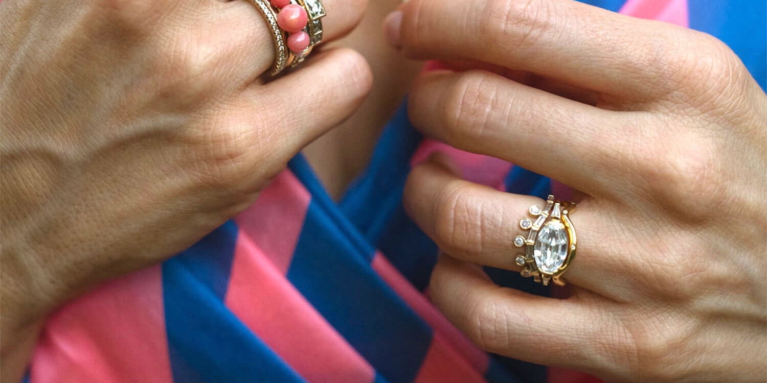 The romantic and sentimental act of collecting and stacking meaningful pieces felt right to her, with her fingers stacked with rings that "feel like tree rings, like an expression of time passing and memories collected."