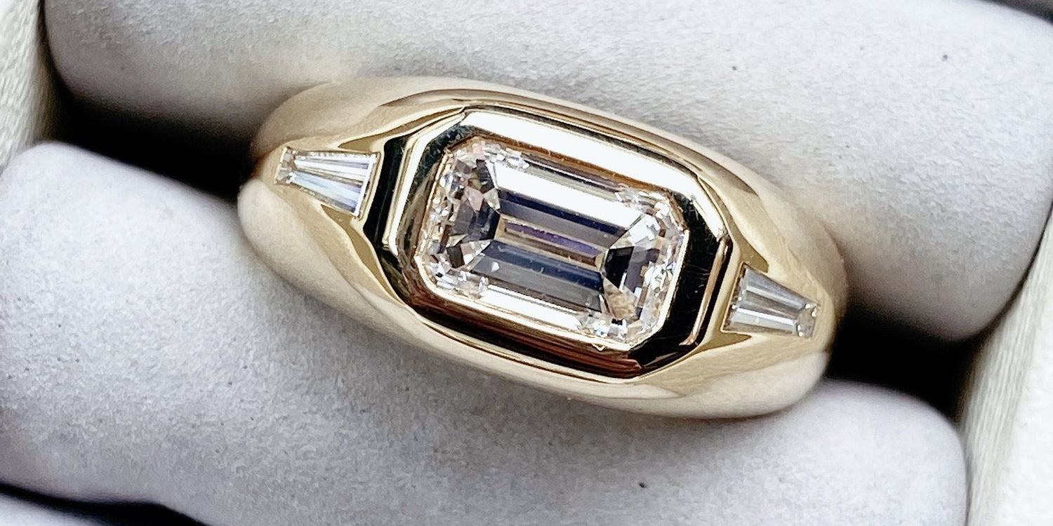Lucy leans further into her signature aesthetic for her bespoke and chunky engagement rings. Literally one of the most popular images we’ve ever posted on Instagram is her beautiful diamond Gypsy ring (below); a stunning and satisfyingly smooth curve of weighty 18k gold that feels timeless and modern all at the same time.