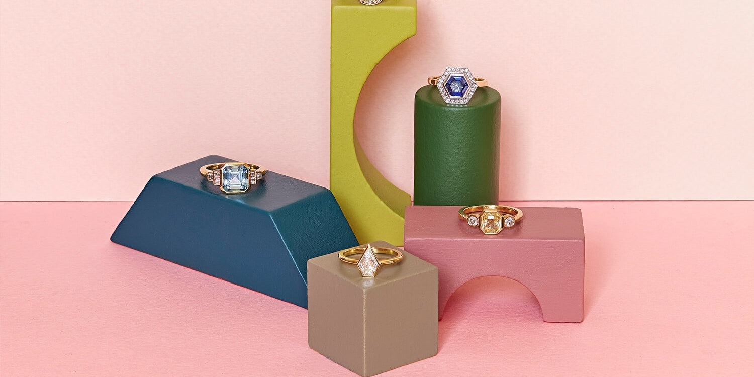 With a modern, clean style and fresh, bright pallette, designer Gee Woods' latest ready-to-wear collection of engagement rings refreshes classic silhouettes and offers a graphic edge to wearable styles.