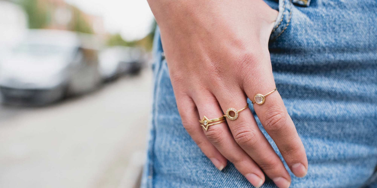 A million miles away from a traditional diamond solitaire ring, these dusty, hazy colour pallettes of diamonds and sapphires are perfect for those looking for something more low-key, and are light on the finger. Best-sellers for the local clientele of rock stars, actors, and artists include this rose cut diamond ring in yellow gold, with a fitted wedding band either side to create a detached halo. A delicate and unusual ring stack creating an alternative engagement and wedding band combination.