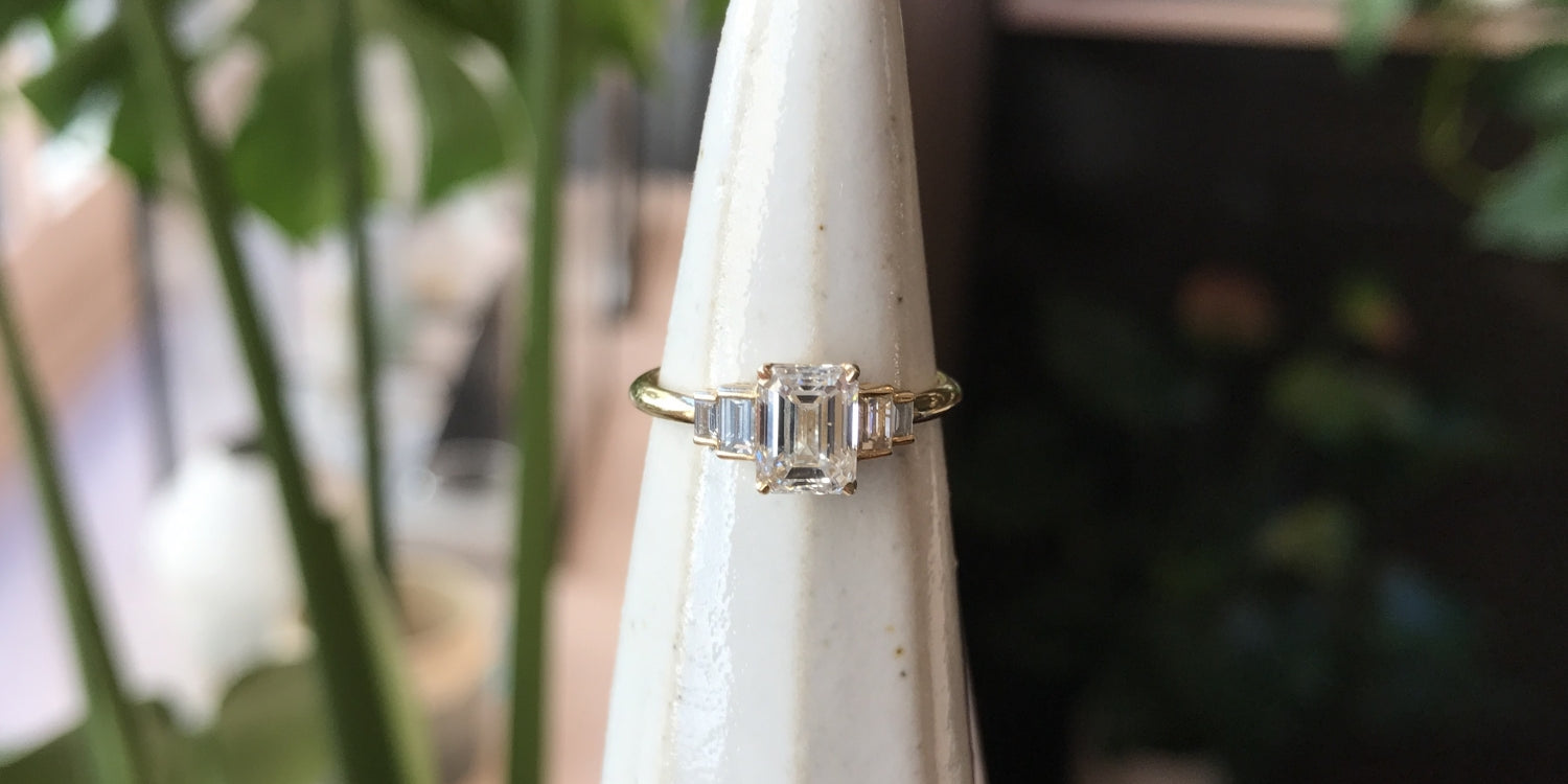 Three Stone Hexagon diamond ring by Rachel Boston.